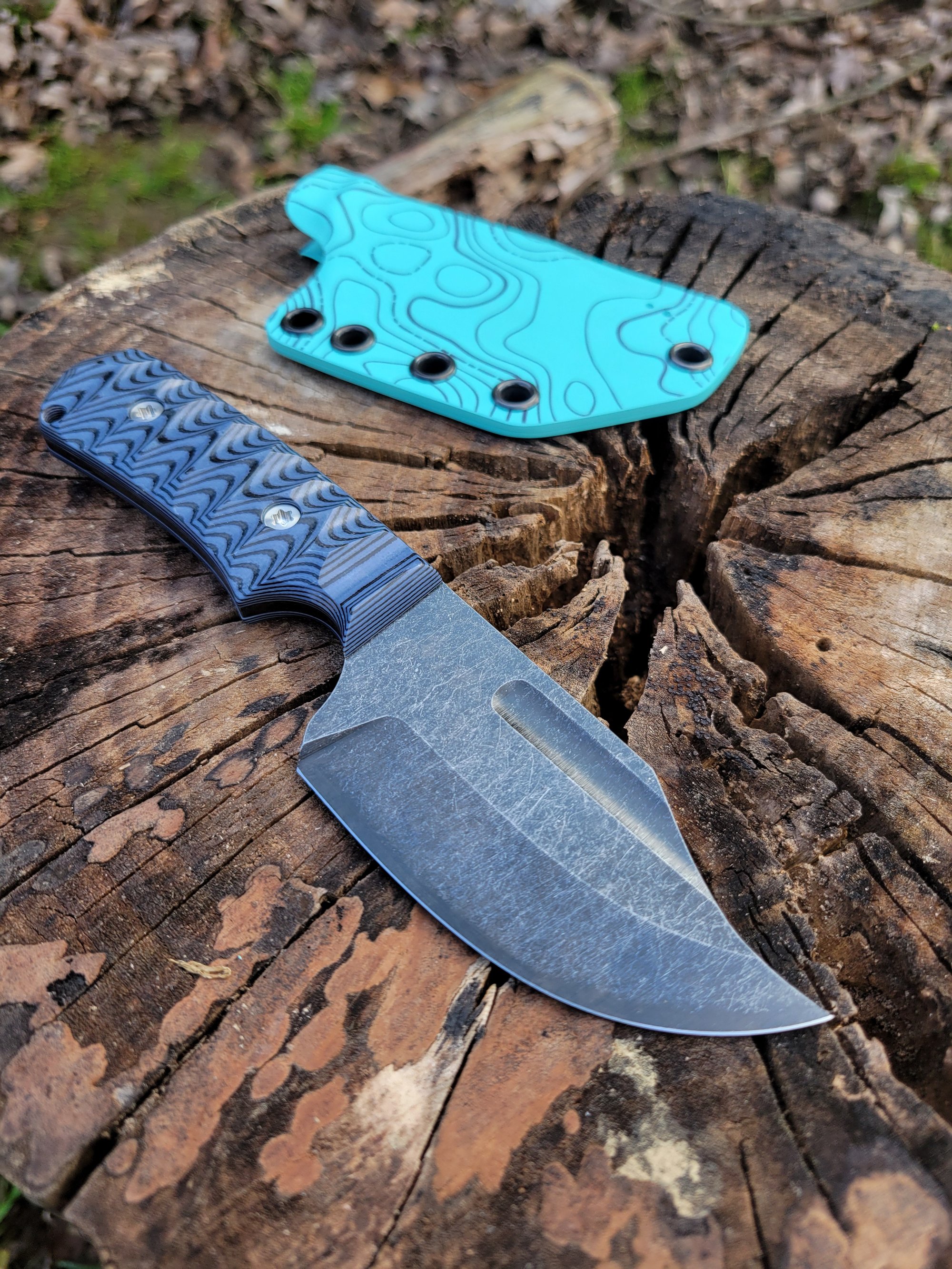The Northeast Ohio Bowie is perfect for every day carry and the outdoors. Made from AEB-L stainless steel, the cutting edge length of this knife is about 3" with an overall length of 6.5". The knife features a fuller, grey/black/blue layered G10 removable scales, satin hardware, and an apocalyptic acid stonewashed finish. Comes with a kydex sheath (pictured)